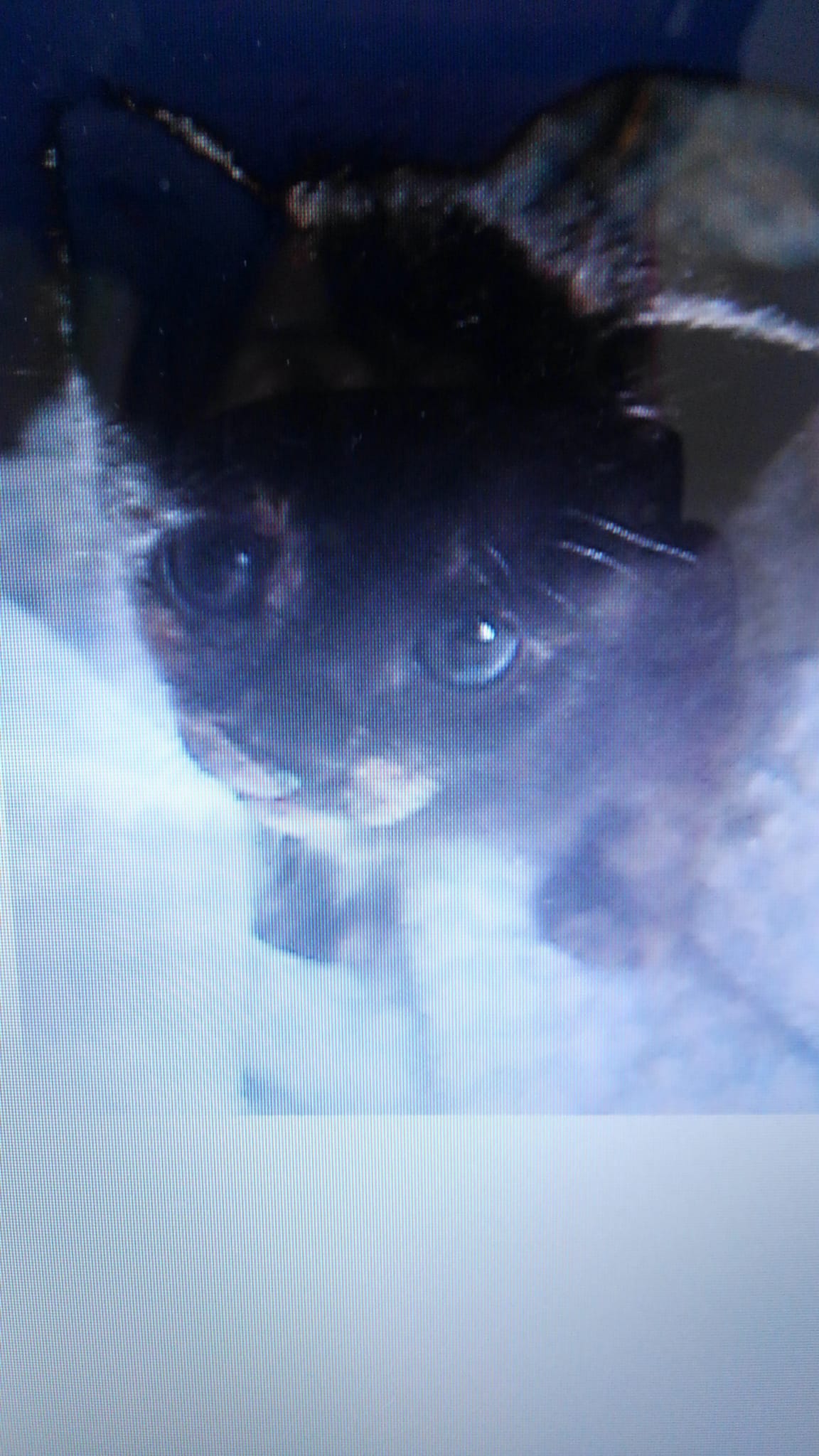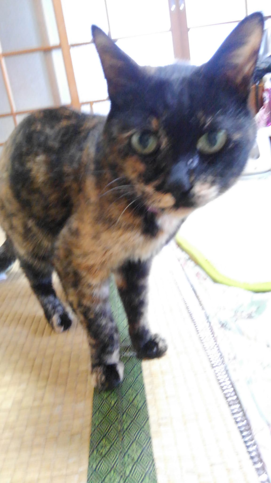 初日はエサをあげ、段ボールのお家の中。ぶち模様があるので、ウチでの呼び名はぶっちゃんに。妻、クリーム色のTシャツを着てる、「ぶっちゃんいるから同じ色」、、気に入ってるではないか、。