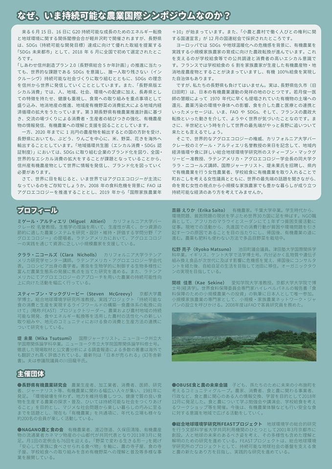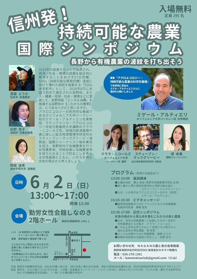 G20環境変動対応サミットin軽井沢の開催を前に、県種子条例制定、全国都市緑化信州フェア(信州花フェスタ2019)、有機農業推進プラットフォームの設立予定と、環境保全・環境にやさしい農業のジャンルで近年追い風を吹かせている長野県ですが、風速を増してしまおうということで、国際シンポジウムを開催いたします。