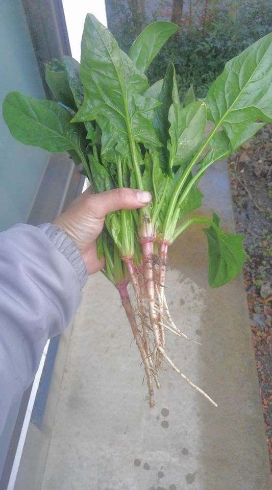 ㎰.ほうれん草も立派に育ったなぁ。耕運機を入れずに種まきしたのですが、自分の根っこで耕してるみたいでフカフカです。こんなに根っこ長くなるのね、、。